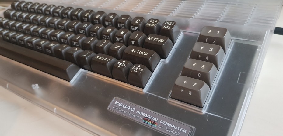 My current setup consists of a Commodore 64 Reloaded MK1 in a transparant Kickstarter case (C64c-model). Connected to a flatscreen (5:4) tv through s-video. I’ve removed the Commodore 1701 monitor from the desk and put it in storage. Although I like the image of the tube more than the flatscreen tv, I couldn’t stand the loud humming of the 1701 anymore. It’s probably dying…