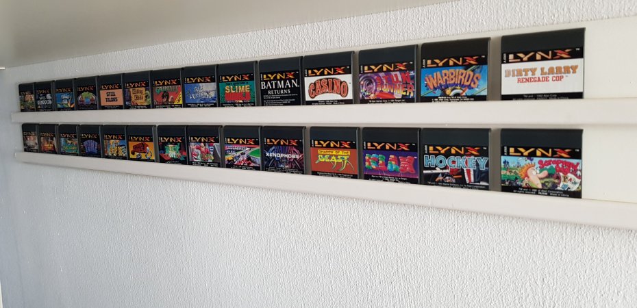 A while ago I made a makeshift holder for my Lynx games cartridges. That proved a bit too fragile and after a short while they all laid on the floor. Today, I’ve made it a bit more sturdy. I glued two long pieces of wood together with a small length of wood in between that has almost the same width as a cartridge is thick. That is glued on one side to a flat piece of wood and that piece I’ve put on the wall with double sided sticky tape. Let’s hope this holds. I think it makes for nice wall decoration and hopefully I will sooner take one out and play it than I did when they were all in a box.
