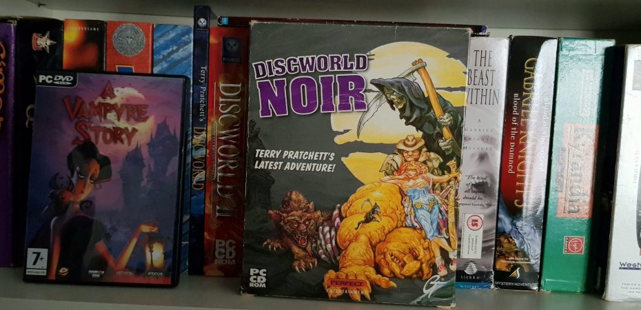 - Discworld Noir. With this game back in the house, it looks like most of the adventure games that I regretted selling are back in my possession. Although, the Discworld Noir that I’ve had before was only the jewel case and not this nice box. It looks very nice next to the original Discworld and Discworld II. Although I love the foldout case of the version of the first Discworld game that I have, I would also like to have the big box version to match nicely to the other to games in the series.