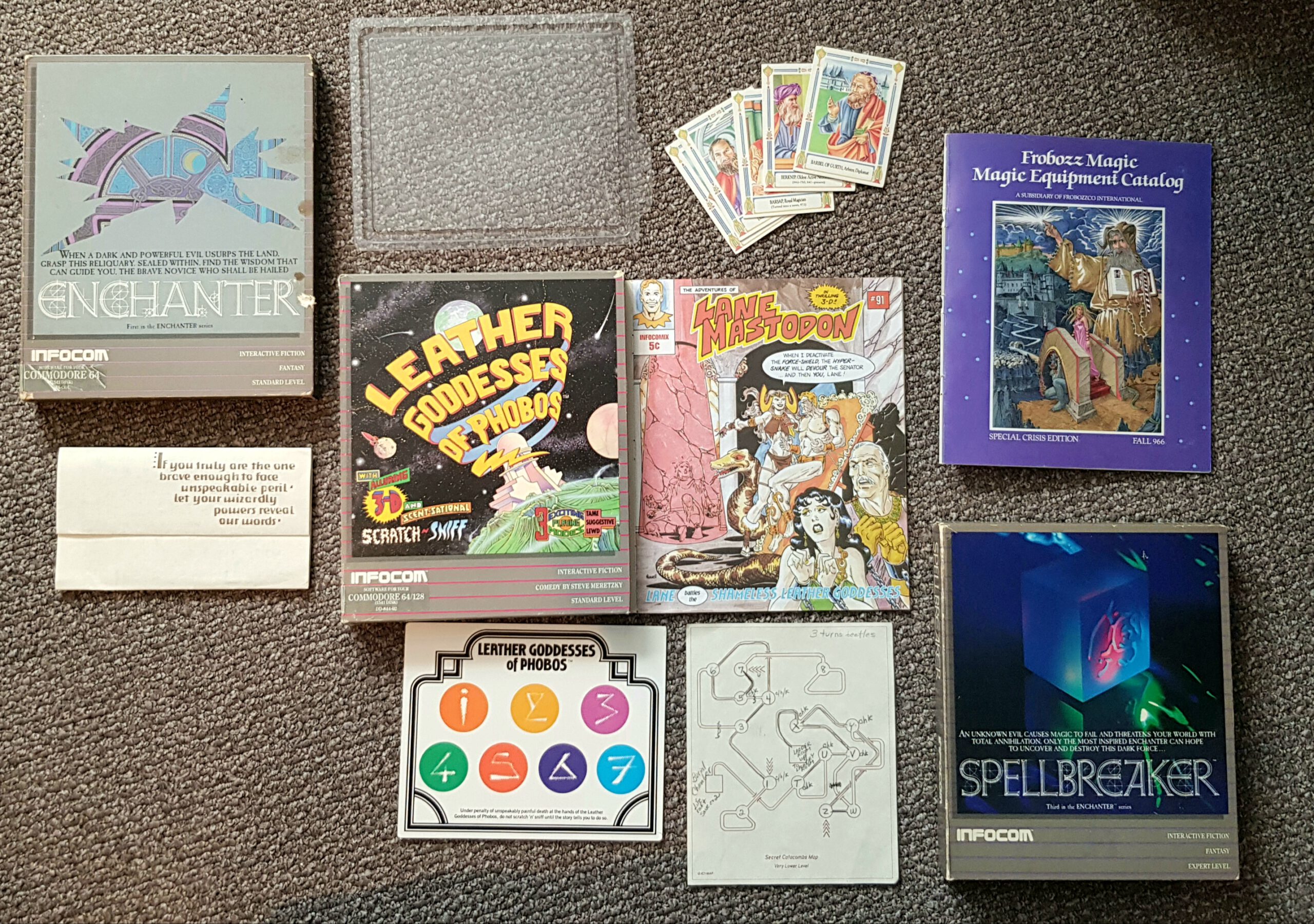 Got Enchanter and Spellbreaker for the Commodore 64 to complete the Enchanter series, although my copy of Sorcerer is the Atari ST version. And I’ve also fot Leather Goddesses of Phobos, also for the C64, complete with scents card, that even have some smells left after 35 years! Maybe I should get rid of the Mastertronic releases that I have…