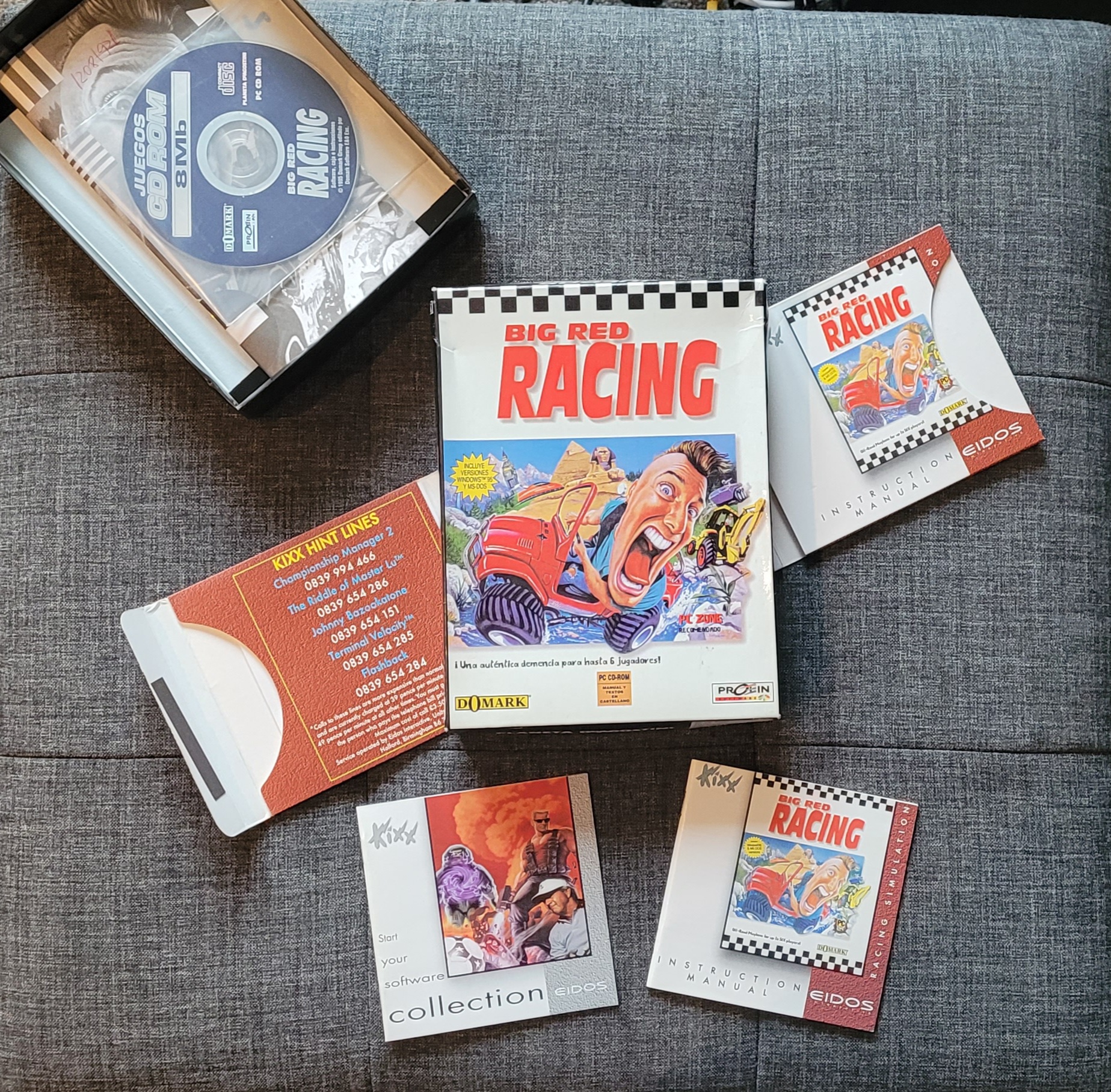 Although I can read and understand German and French enough to enjoy games in those languages, that’s not the case for Spanish. So it always stuck a little bit that the version of Big Red Racing that I have, in a sadly rather dented box, is in Spanish. So when I saw a cd and manual of the English version, I quickly opted to get that to supplement the box contents. It’s not like there isn’t any space for it. Now that I think about it, it is really true that all these boxed games in my gameroom take up a lot of space, most of it probably a lot of empty space. So it’s my duty to fill that empty space with content.