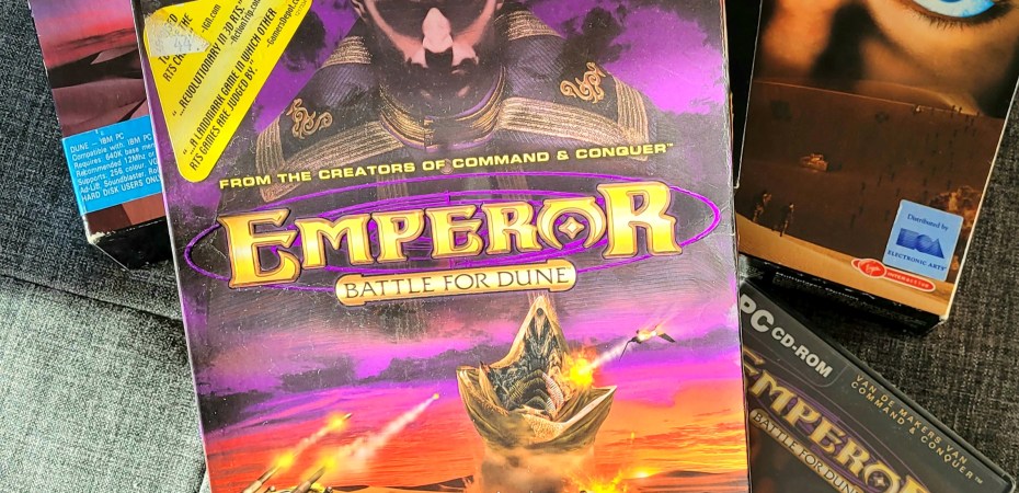 It took me a long time but I finally found a big box for Emperor Battle for Dune. I already had the game in a DVD case, but that didn’t look very nice besides Dune, Dune II and Dune 2000. Complete in box games turned out to be quite pricey, so when I saw a seller offering only the empty box for a reasonably price, I knew that was exactly what I was looking for. And a nice box it is. Much cooler than the box of Dune 2000. Although it is of the flimsy open-at-the-top quality that so many of the US releases of big box computer games come in.