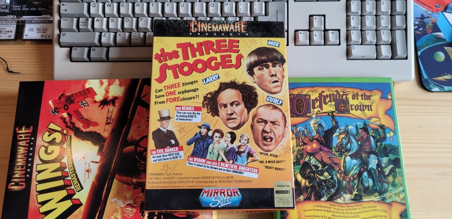 Although I’ve never played The Three Stooges, I couldn’t resist adding another Cinemaware game to my collection when it turned up for a reasonable price. I’m looking forward to checking it out. It looks nice on the shelf beside Defender of the Crown and Wings. I’m still regretting selling It Came from the Desert and Antheads.