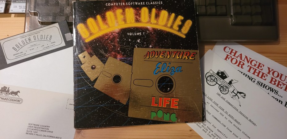 I only just recently got my hands on some games that came in so-called flat boxes. While browsing Ebay I came across another such a package containing a collection of truly old games, such as Adventure and Eliza. It also featured in one of LGRs video’s about these kind of packaging. I read about Eliza in one of the Digital Antiquarian’s excellent posts and it’s nice to have a copy in my collection, even if it’s not a stand alone version and only in a collection, and even if it might contain somewhat dumbed down versions of the games.