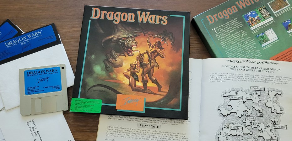 After I got my hands on all the three Bard’s Tales, I started looking for the game to put next to them. That would of course be Dragon Wars. I saw a copy being offered quite near to where I live, but I missed out because other buyers put in higher bids than I was prepared to offer. That triggered me to look a bit further away and sure enough a seller across the pond offered a copy for much less. Although I should be more hesitant about buying games in the US because of the steep shipping costs and import fees, I must admit I bought quite a few games in the last couple of weeks, of which, Dragon Wars is one of them. It is a very nice exemplar with the copy-protection and story enriching paragraphs all accounted for in the manual. A very nice addition indeed.
