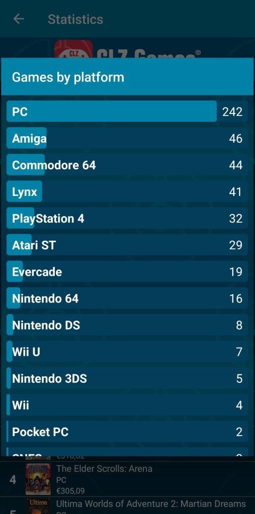 CLZ Games told me I now have 500 boxed games in my collection. That includes multi cart games cartridges from the Evercade that count as one game and some N64 and Atari Lynx games of which I only have the cartridge. I always thought my collection would peak out at around 500, but I still have quite a lot of games on my wish list. I can see it reach 600 eventually.