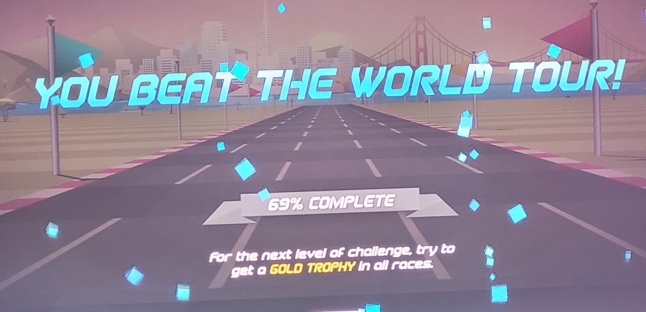 Today my son and I gathered the last points to open up the final races of the world tour of Horizon Chase Turbo. The last three races were quite tough, but we managed to finish at least at third place and by doing so completed the world toyr. My son had been driving the colorful Volkswagen bus the last races. He loves rainbows. But he didn’t want to do the final race with the bus because “it’s a car racing game and not a bus racing game.” I’ll always have fond memories of playing this game together with him.