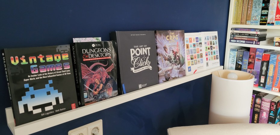 I’ve been busy reorganizing the gameroom. I’ve moved my work space to the window and the retro computers away from it. I’ve put a shelf on the wall so I have more space to display the great books about video games I have. And there’s still space above the shelf to put another one up, so I might just do that. And also maybe some half width shelves on the other wall where I can display some other stuff. IKEA here I come.
