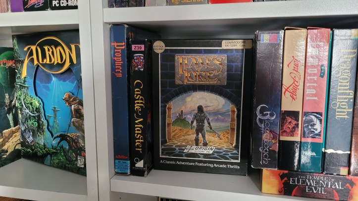 Prophecy (a.k.a. Prophecy I: The Fall of Trinadon) is a game that turned up in my daily search of the local online market place. It looks like a game that belongs in my collection. Sadly, it doesn’t have the manual included, so I need to keep an eye out for that. The price I paid for it was very modest, so I don’t feel to bad about it. It benefits from my recent expansion of shelves for rpg games and sits nicely next to Castle Master and Times of Lore. Another game mentioned in the CRPG Book that’s in my collection.