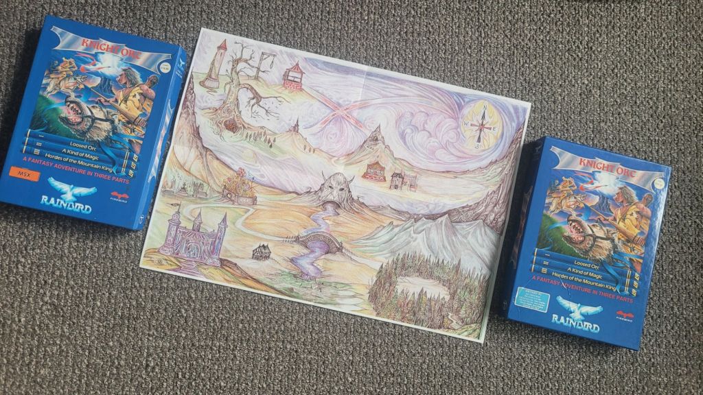 My copy of Knight Orc was missing its map. I now bought a version that has a map. Now I have to decide which version I’ll keep. I’d rather keep the new version which is for PC and comes on two 5.25 inch floppies. But the box is a bit dented and discolored compared to the MSX version I already have. That one comes with three cassettes. It’s the only MSX game in my collection. I cannot simply swap the boxes, because the platform is stickered on the front and won’t come off clean. Decisions, decisions.