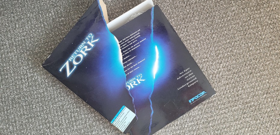 I bought one of the few Zork games that I didn’t have yet: Return to Zork. It’s the Zork that was released between Zork Zero and Zork Nemesis. Where Zork Zero, which I also don’t have (yet), still has some feelies in the box, and Zork Nemesis is just a boring big box, albeit one with a very nice looking manual, this Zork has a somewhat unusual box design. The top-left part of the box slides off the inner box to expose an opening on the top. It’s the Mac version of the game. I don’t know if the Windows version has the same design, but it’s a nice concept. All those different designs makes collecting big box games fun! There’s nothing fancy inside the box though. Just a manual with an admittedly interesting title: Encyclopedia Frobozzica.
