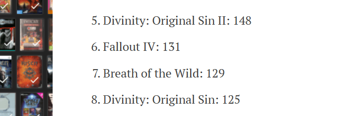 No big surprises there. Maybe only Dragon Age: Inquisition being that high. That’s probably due to multiple playthroughs. Almost all games I played multiple times, except Baldur’s Gate II and GTA V.