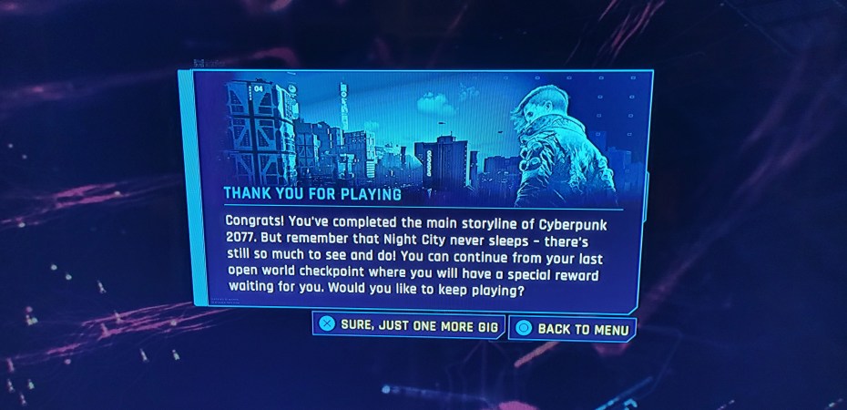 The ending of Cyberpunk was really cool. I choose one ending and stuck with the consequences. Although it was a satisfying ending, it immediately left me with a desire to see what the alternative would be like. I’ll save that for a later time though. First I want to play other games. But I will definitely return to Night City. Probably as a girl, maybe Corpo instead of Nomad, and with the Phantom Liberty DLC.