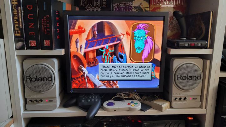 I started out with the EGA version, which isn’t much to look at. Although I guess you can have nostalgic feelings if you’ve played it in the 80s. It’s nice to once again play a game that supports the Roland MT-32 sound. I have it hooked up to the Roland MA-12 speakers. But the sound simultaneously goes through my Technics amplifier with the KEF eggs and a simple subwoofer, which provides a very appropriate spacious listening experience.