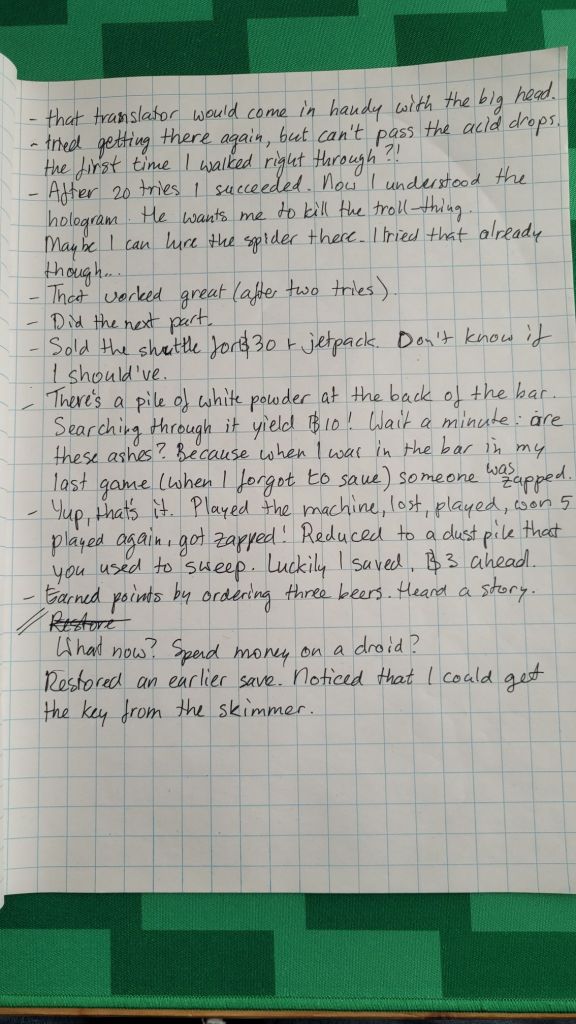 After what feels like all the ways you can die on the space ship you start out on (there’re probably a ton more ways though), I managed to escape and land on a planet. I turned left and quickly got eaten by a monster. Next I turned right and got eaten because I looked in a hole. Then I progressed further and got eaten by a tentacled beast. Then it was time to end the play session.