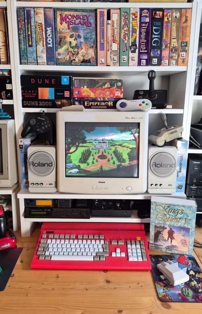 I made some changes to my retro computer setup and I think it worked out really well. It certainly made me want to play more old PC games. I put my MiSTer in an Amiga 1200 case with the MiSTress 1200 I/O board and I changed my LCD for a CRT VGA monitor. I had to put in some extra shelves to support that thing and reorganize some of the games and accessoires around it, but now it feels like a really cosy setup.
